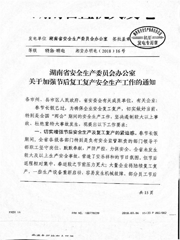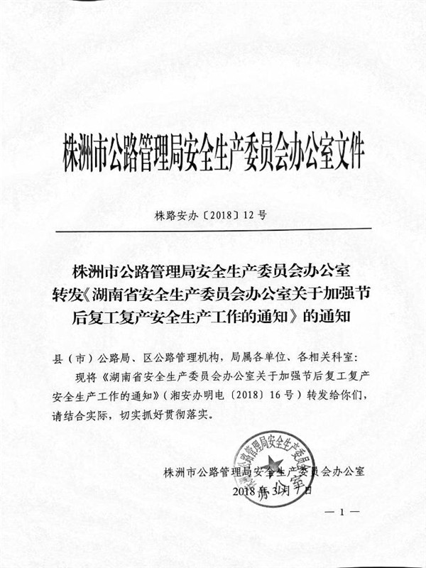 株洲市公路管理局转发《湖南省安全生产委员会办公室关于加强节后复工复产安全生产工作的通知》的通知